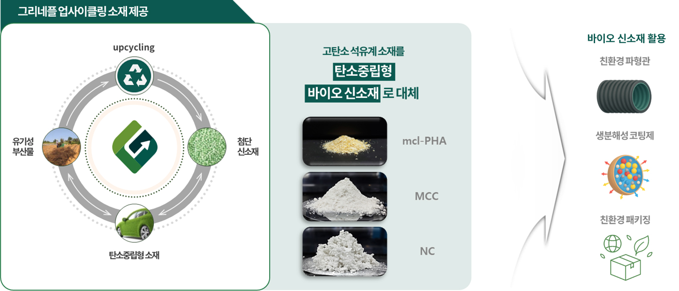 그리네플은 Closed-loop형 청정생산공정을 통해 기후변화에 대응할 수 있는 자원순환형 바이오 신소재를 공급합니다.