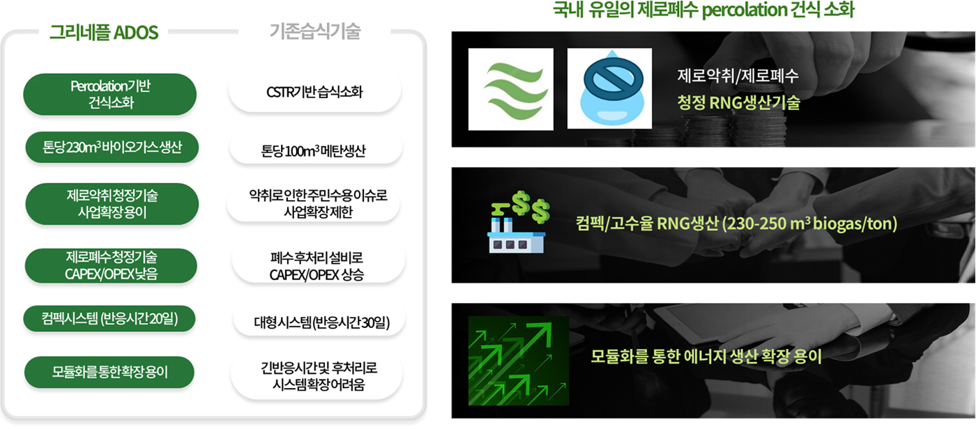 Greeneple owns proprietary ADOS technology, producing higher yield of CH₄ with zero odor & zero wastewater.